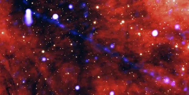 Мощный поток частиц, которые извергает пульсар. Синим цветом показаны частицы в рентгеновском диапазоне, как их увидел телескоп "Чандра", а красным цветом – показаны частицы в оптическом диапазоне