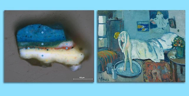 Микроанализ крошечных образцов картины показывает, что большая часть "Синей комнаты" написана непосредственно поверх портрета с мужчиной, без грунтовки, и что палитра Пикассо становилась все более приглушенной.