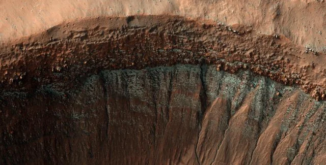 Марсианский кратер. Камера HiRISE, которая установлена на космическом аппарате Mars Reconnaissance Orbiter (MRO) имеет очень высокое разрешение, а это значит, что с высоты в 300 км на поверхности Марса можно различить детали размером в 30 см