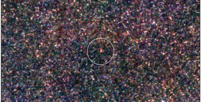 Изображение в искусственных цветах инфракрасного излучения массивного протоскопления галактик (в круге), которое сформировалось примерно через 1,4 миллиарда лет после Большого взрыва