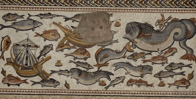 Длина этого произведения составляет почти 17 м, а ширина 9 м. На нем изображены торговый корабль, разные растения, мифические существа, а также животные из самых отдаленных уголков Римской империи и за ее пределами, от льва, жирафа и носорога до тигра, быков и птиц.