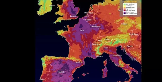 Спутниковые данные показывает, что риск возникновения лесных пожаров в Европе очень высок. Зленеым и желтым цветовы показаны регионы с смамым низким риском пожаров, а фиолетовым цветом показаны регионы с самым высоким риском возникновения лесных пожаров