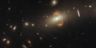 На новом снимке телескопа Хаббл в центре видны две одинаковые галактики, окрашенные в оранжевый цвет и соединенные нитью. Но на самом деле это одна галактика и ее зеркальное отражение. Эта галактика называется SGAS J143845+145407 и находится она на расстоянии в 6,9 млрд световых лет от нас.