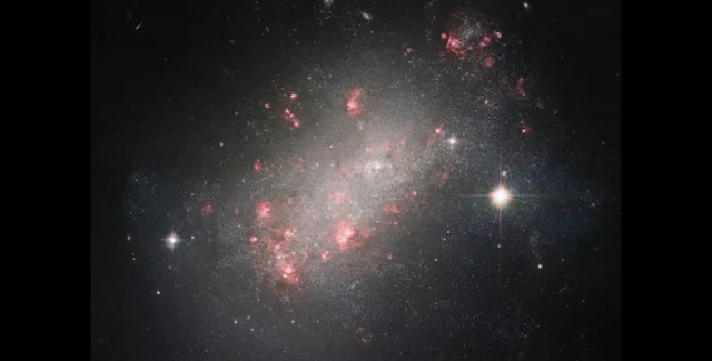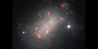 На новом изображении космического телескопа Хаббл особое внимание привлекают ярко-красные регионы, где происходит бурное образование новых звезд. Газообразный водород, который выпускают эти звезды как раз и создает такое красное свечение.