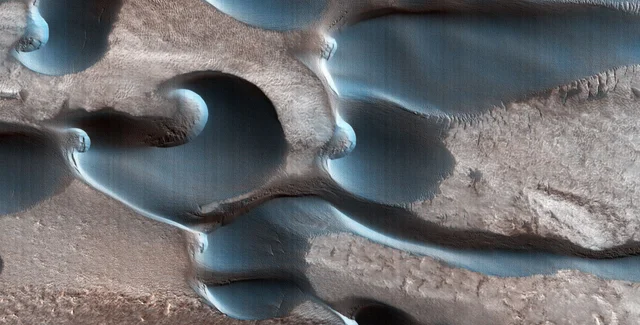 Во время съемки камера HiRISE, которая работает в оптическом диапазоне, как и человеческий глаз, использовала специальные цветовые фильтры, а потому эти песчаные дюны имеют голубой оттенок. HiRISE также может работать и в ближнем инфракрасном диапазоне, что позволяет узнать больше о минералах на поверхности Марса.