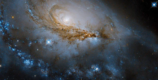 На изображении, как его описали ученые из NASA, можно увидеть сверкающие голубые регионы, в которых находятся молодые звезды. Они населяют пыльные спиральные рукава этой галактики, которые вьются вокруг светящегося центра галактики NGC 1961.