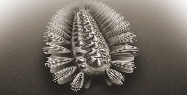 Древний червь обитал на Земле 518 миллионов лет назад. Он был защищен массивом бронированных панцирных пластин и покрыт множеством лопастных выступов и пучков щетинок по бокам его тела.