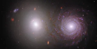 NASA опубликовало новое удивительное изображение космоса. На снимке показаны две галактики, которые составляют пару под названием VV 191. Эта пара состоит из яркой эллиптической галактики и спиральной галактики. Для того, чтобы получить полную картину происходящих здесь процессов, телескоп Уэбба использовал данные стареющего телескопа Хаббл, пишет Forbes.