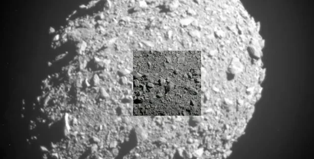 По данным NASA примерный размер астероида Диморф составляет чуть больше 160 метров. А размер его компаньона, вокруг которого он вращается, астероида Дидим – почти 800 метров. До того, как космический аппарат DART столкнулся с целевым астероидом, он успел прислать на Землю несколько фотографий его поверхности. В частности, на одном из снимков был показан участок поверхности астероида диаметром в 30 метров.