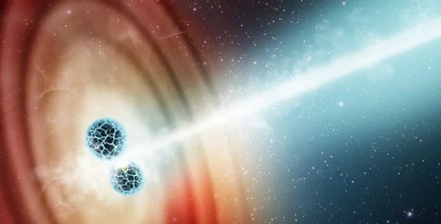 Астрономы стали свидетелями уникального события – столкновения двух нейтронных звезд, которые являются очень плотными ядрами, когда-то взорвавшихся очень массивных звезд. В результате этого столкновения в космос была выброшена струя вещества, которая согласно данным космического телескопа Хаббл, двигалась со скоростью в 7 раз больше скорости света