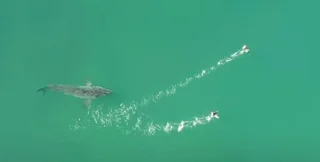На видео видно, как акула приближается к птице, а дальше происходит удивительное. Баклан буквально запускает "фекальную бомбу" прямо в морду большой белой акулы, чтобы сбить ее со следа. И, похоже, это успешно сработало — операция "Дымовая завеса" прошла явно с положительным результатом.