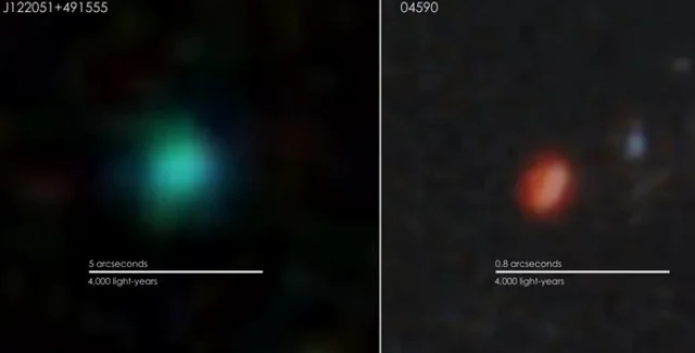 Зелеными эти галактики кажутся из-за того, что большая часть света этих редких галактик исходит от ярких светящихся газовых облаков, которые излучают свет на определенных длинах волн, а не от широкого спектра света, который излучают звезды в других галактиках.