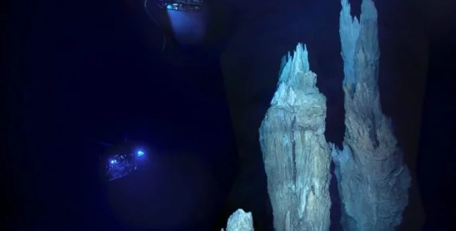 Океан скрывает множество невероятных тайн и одну из них ученые обнаружили к западу от Срединно-Атлантического хребта, где из мрака темной воды вдруг показался зубчатый ландшафт башен, кремово-карбонатные стены которого в свете исследовательского судна кажутся прозрачно-голубыми, пишет Science Alert.
