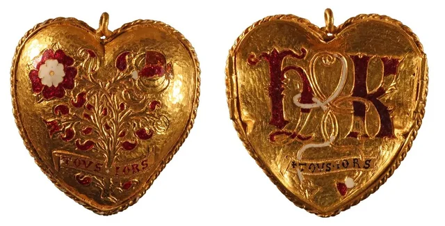 Изделие в форме сердца украшено красно-белыми цветочными узорами, изображающими союз короля Генриха VIII и его первой жены Екатерины Арагонской, нашли с помощью металлоискателя в Великобритании.