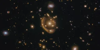 Гравитационное линзирование происходит, когда яркий свет от очень далекого объекта искривляется и огибает другой объект (скопление галактик или огромную галактику), который находится ближе к Земле. В результате получается своеобразная оптическая иллюзия, благодаря которой свет от далекого объекта окружает более близкий к нам объект.