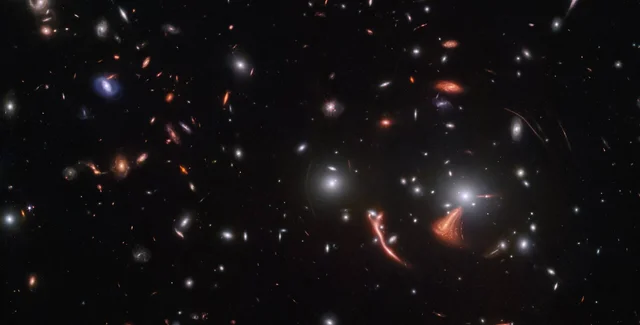 На новом снимке телескопа видны десятки галактик, но в нижней правой части изображения некоторые из этих галактик, включая галактику Космический Морской Конек, выглядят искаженными. Они представлены в виде дуг из света.