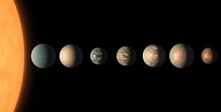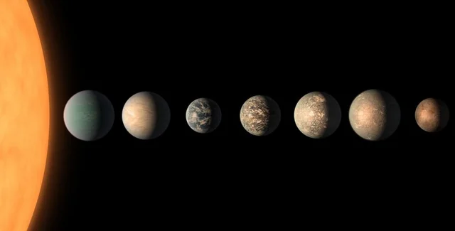 В этой звездной системе, которая расположена на расстоянии в 40 световых лет от нас, вокруг звезды красного карлика вращается 7 экзопланет. И все эти планеты имеют схожий с Землей размер. Но только 4 из этих экзопланет находятся в обитаемой зоне своей звезды.