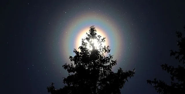 Такие кольца появляются в небе, когда солнечный свет рассеивается обычной пыльцой, летающей в воздухе. Похожие на звезды блестки, которые можно увидеть, как внутри, так и снаружи радужных колец, являются отдельными зернами пыльцы.