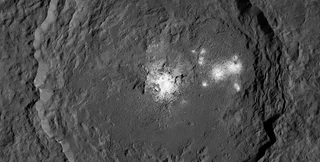 Карликовая планета Церера является самым большим объектом в главном поясе астероидов, расположенном между Марсом и Юпитером. Кратер Оккатор, который находится на Церере, впечатляет тем, что содержит яркое пятно в центре, которое стало известно, как и собственно сам кратер, после того, как Цереру в 2015 году исследовал аппарат Dawn.Кратер Оккатор имеет диаметр 92 км и глубину 3 км. Считается, что этот кратер появился в результате удара астероида размером в 5 км примерно 20-25 млн лет назад.