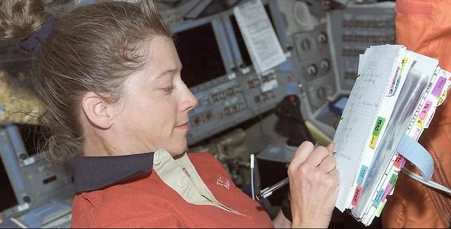 Памела Мелрой изучает контрольный список процедур космического корабля "Атлантис" шариковой ручкой | Фото: NASA