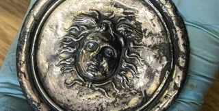 Эта фалера имеет удивительное изображение Медузы. В древнегреческой мифологии Медуза была женщиной со змеями вместо волос. Согласно легенде, ее взгляд мог превратить в камень любого, кто смотрел на нее. Важно отметить, что голова Медузы, кроме художественного значения, служила также апотропеическим символом — талисманом, который, по поверью, обладал защитными свойствами.