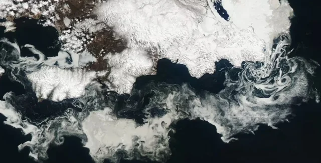Спутник NASA обнаружил удивительное противостояние ледяных водоворотов, бурлящих на сотни миль в Охотском море.