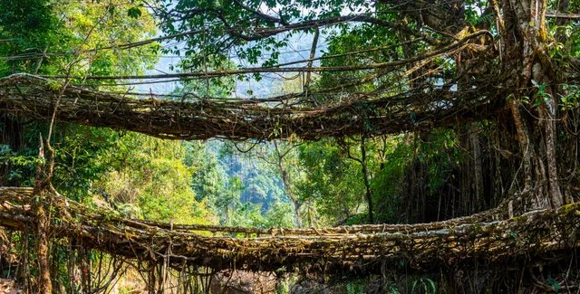 В густых джунглях штата Мегхалая можно увидеть сочетание человеческой изобретательности и сосуществования с природой. Местные народы кхаси и джайнтии, хорошо знакомые с коварными вызовами жизни в этих лесах, нашли гениальное решение для навигации на своей местности: живые корневые мосты.