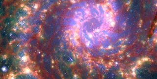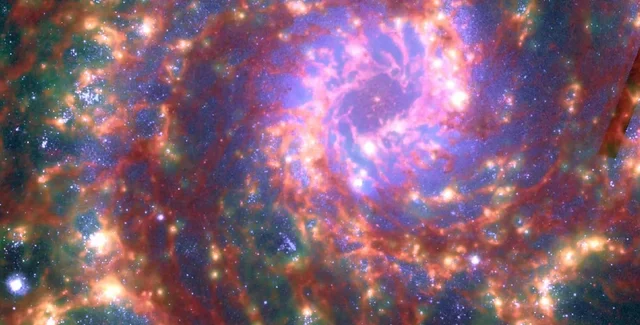 На новом снимке можно увидеть нити газа, которые составляют основу этой спиральной галактики. Но это не просто новый взгляд на галактику M74. Используя предыдущие данные наблюдений космического телескопа Хаббл и наземного телескопа VLT, ученые получили новый вид этой галактики и теперь видно, где именно новые звезды создают газовые суперпузыри и как они влияют на эволюцию галактики вместе с ними.