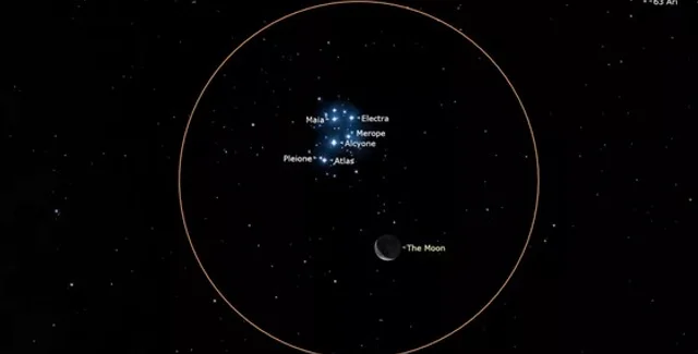 Знаковая "космическая встреча" произойдет на фоне созвездия Тельца, если посмотреть на восток. Луна будет располагаться визуально на расстоянии в примерно с ширину ладони чуть ниже и левее, чем рассеянное звездное скопление Плеяды. В то же время Юпитер будет находиться немного выше и справа от звездного скопления.