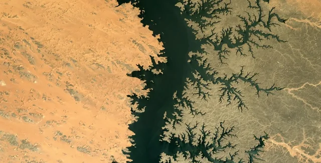 Озеро Насер, протянувшееся почти на 500 километров через Египет и Северный Судан, является одним из крупнейших искусственных озер в мире и представляет собой гигантское водохранилище. Оно образовалось в результате возведения Асуанской высокой плотины на Ниле и привлекает к себе внимание необычным внешним видом, пишет IFLScience.