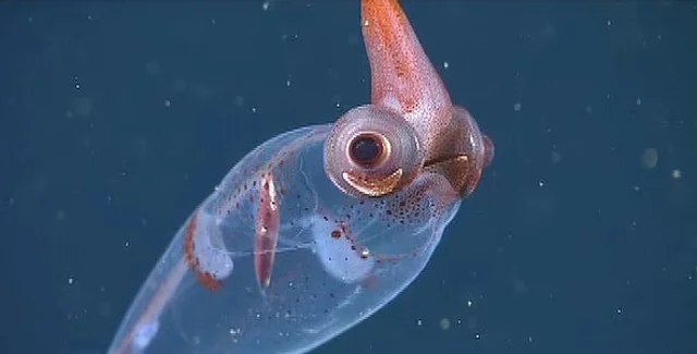 Это призрачное существо в научном мире известно как стеклянный кальмар. Несмотря на то, что сам он прячется в темных водах океана, его внутренние органы будто выставлены на всеобщее обозрение. Но даже не это самое удивительное, помимо хорошо видимой пищеварительной железы, этот 50-сантиметровый кальмар удерживает внутри своего тела растворы аммиака, что и позволяет ему плавать.