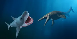 Смертельная схватка 20-метровых чудищ: острые зубы Мегалодона против мощных челюстей Мозазавра