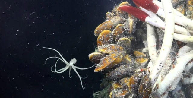 Вулканосьминог рядом с мидиями и трубчатыми червями | Фото: ROV SuBastian/Schmidt Ocean Institute