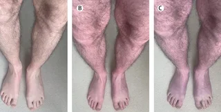 33-летнего мужчину направили в специализированную клинику после того, как в течение полугода у него проявлялись необычные симптомы. Когда он вставал, его то в ногах ощущал тяжесть, появлялись зуд и покалывание, да к тому же ноги приобретали фиолетовый цвет. Эти симптомы исчезали, когда мужчина ложился.