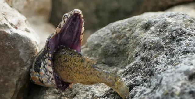 Многие виды змей едят рыбу и для этого они могут очень широко раскрыть свою пасть, чтобы проглотить даже крупную добычу. Но в данном случае змея пыталась проглотить инвазивный вид рыб для юга Франции.