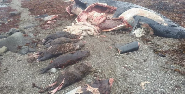 Ученые изучили тело кита и обнаружили в ее желудке и пищеводе полутораметровых млекопитающих.