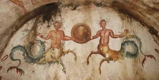 В гробнице есть изображение двух ихтиокентавров, держащих круглый щит рядом с двумя младенцами | Фото: Superintendency for the Metropolitan Area of Naples