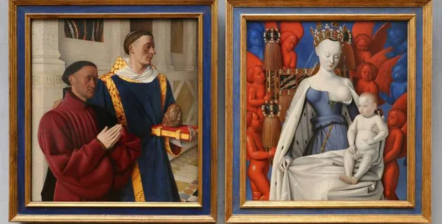 Две картины из "Меленского диптиха" (около 1455 г.) Жана Фуке: "Этьен Шевалье со святым Стефаном" (слева) и "Богородица с младенцем в окружении ангелов" на выставке в Gemäldegalerie в Берлине, Германия | Фото: Sailko, CC BY 3.0