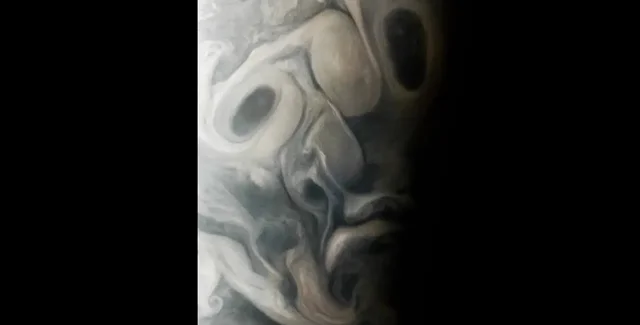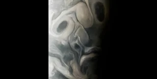 Данный регион на Юпитере получил название Jet N7 и находится он в северном полушарии Юпитера в районе 69 градусов северной широты. На снимке видна линия терминатора планеты, разделяющая его дневную и ночную стороны. Но как раз там, где газовый гигант освещен светом Солнца, можно увидеть недовольное лицо с глазами, носом и ртом.