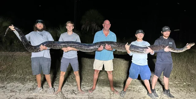 На днях охотникам удалось поймать гигантского бирманского питона, обнаруженного в Южной Флориде. Он достигал невероятных 5,2 метра в длину, а его вес составлял 90 килограммов. Охотники отмечают, что изначально приняли его за аллигатора: "это было больше, чем змея, это было чудовище". Таким образом, пойманный охотниками питон, стал вторым по величине из всех питонов, которые когда-либо были пойманы во Флориде. Вес самого тяжелого питона, пойманного здесь, составил 98 кг, он был отловлен в 2022 году.