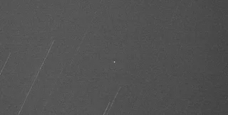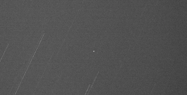 С помощью телескопа астроном следил за очень быстрым перемещением объекта на низкой околоземной орбите. Эта сумка выглядит как светящаяся точка в центре изображения и резко выделяется на фоне звезд, которые видны в виде длинных светящихся полос на заднем плане.