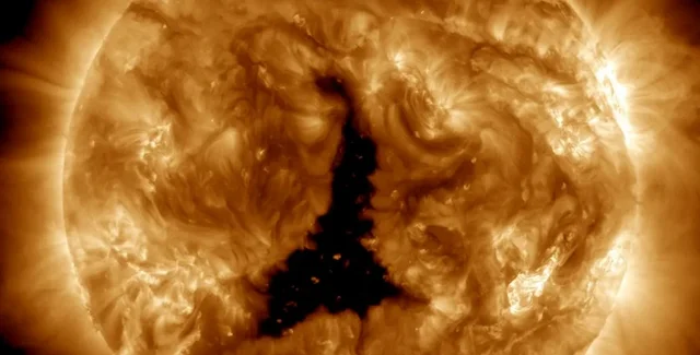 Корональные дыры, хотя и имеют устрашающий вид, имеют более низкую температуру и плотность, чем окружающая плазма на Солнце. Часто они появляются в полярных регионах Земли, но иногда возникают и в других участках Солнца.