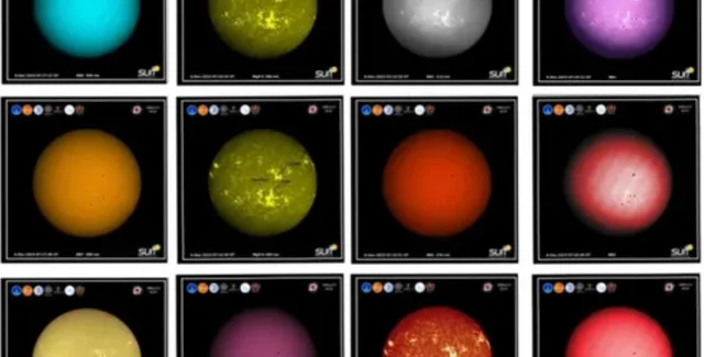 На снимках, полученных благодаря инструменту SUIT (сокращение от Solar Ultraviolet Imaging Telescope), видны несколько особенностей на поверхности нашей звезды, среди которых несколько солнечных пятен, а также "пляж" и парочка тихих областей.