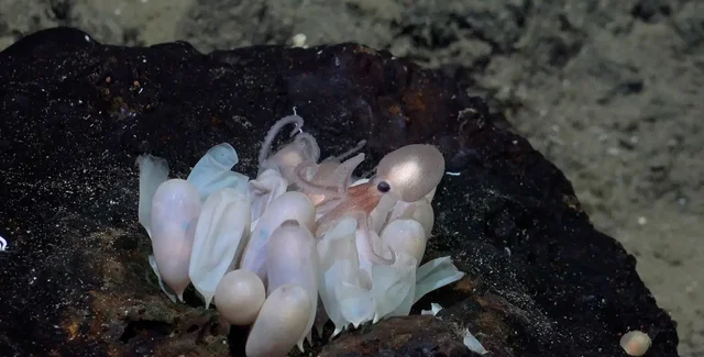 Удивительные кадры глубоководного головоногого моллюска были сделаны с помощью глубоководного дистанционного аппарата ROV SuBastian. На кадрах видна удивительная жизнь "инопланетного осьминога" с головой похожей на жемчужину. Ученым также удалось запечатлеть глубоководных осьминогов возле их не менее инопланетных яиц, из которых вскоре вылупится их семейство.