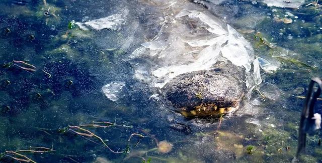 Будто мухи в янтаре. Как аллигаторы переживают холода, сидя в полностью замерзшем озере (видео)