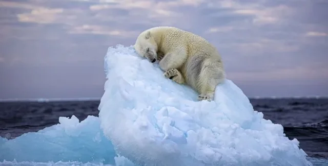 Душераздирающий снимок, где молодой белый медведь дремлет на тающих обломках крошечного айсберга, дрейфующего в арктическом море у побережья Шпицбергена. Этот трогательный кадр был сделан британским фотографом-любителем Нимом Сарихани, пишет Live Science.