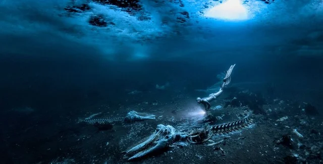 Сам автор фото Алекс Доусон из Швеции, но фото было сделано у Тасиилака в Гренландии — городка с населением всего около 2000 человек и расположенного у побережья Северной Атлантики, примерно в 106 километрах к югу от полярного круга. На кадре видно, как дайвер приближается к одному из двух скелетов кита сверху, с просветом во льду наверху и фонариком, освещающим кости.
