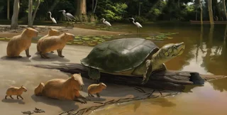 Более того, команда предполагает, что эти пресноводные черепахи-гиганты, вполне вероятно, могли соседствовать с поселениями в Южной Америке. Авторы исследования отмечают, что точный возраст останков все еще не ясен: предварительные оценки свидетельствуют о том, что гиганты жили на Земле от 40 000 до 9 000 лет назад, что соответствует позднему плейстоцену.