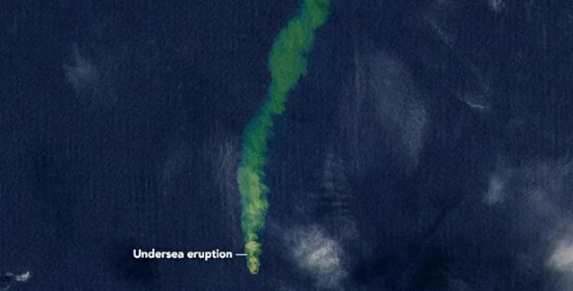 Спутниковый снимок шлейфа обесцвеченной воды возле подводного вулкана Кавачи, сделанный 8 марта 2024 года