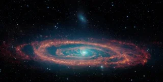 Галактика Андромеды, расположенная примерно в 2,5 млн световых лет от Земли, является ближайшей к Млечному Пути крупной галактикой. В отличие от характерных спиральных рукавов, вокруг центра нашей галактики, ядро Андромеды окружено множеством колец пыли.